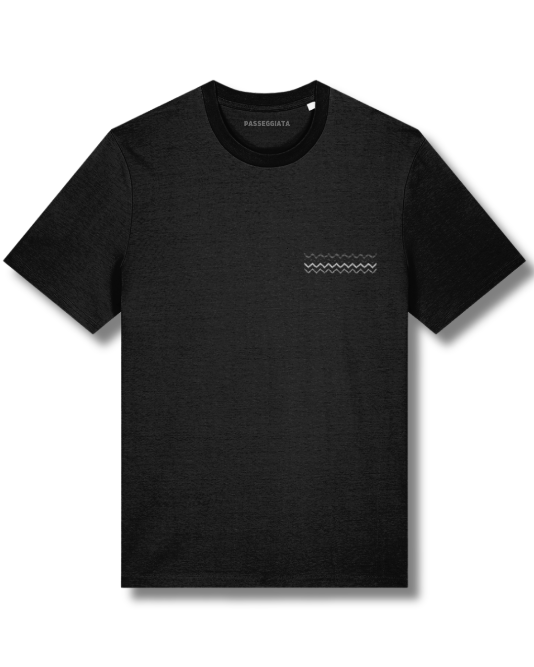 Our Passeggiata Organic Cotton Short Sleeve T-Shirt with Black/Grey embroidered Zig Zag pattern Image on the front.
