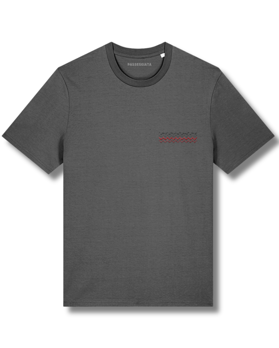 Our Passeggiata Organic Cotton Short Sleeve T-Shirt with Red/Black embroidered Zig Zag pattern Image on the front.
